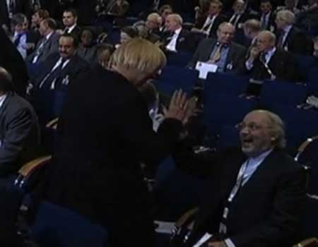 ويظهر الفيديو سفير إيران في برلين “علي رضا شيخ عطار” وهو يصافح النائبة في البرلمان الألماني “كلوديا روث” ويمازحها على هامش مؤتمر أمني في ميونيخ، كما يضرب يده بيدها للتحية على طريقة الأوربيين (high-fiving)، وتعني ضرب الكف بالكف على سبيل التحية غير الرسمية.