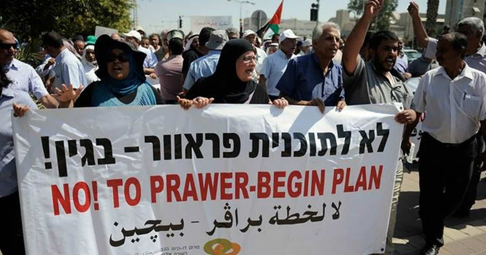 ورفع المشاركون يافطات بأسماء القرى المنوى الاستيلاء عليها إضافة لعبارات رافضة للمخطط الهادف لمصادرة 80 ألف دونم من أراضى بدو سكان النقب.