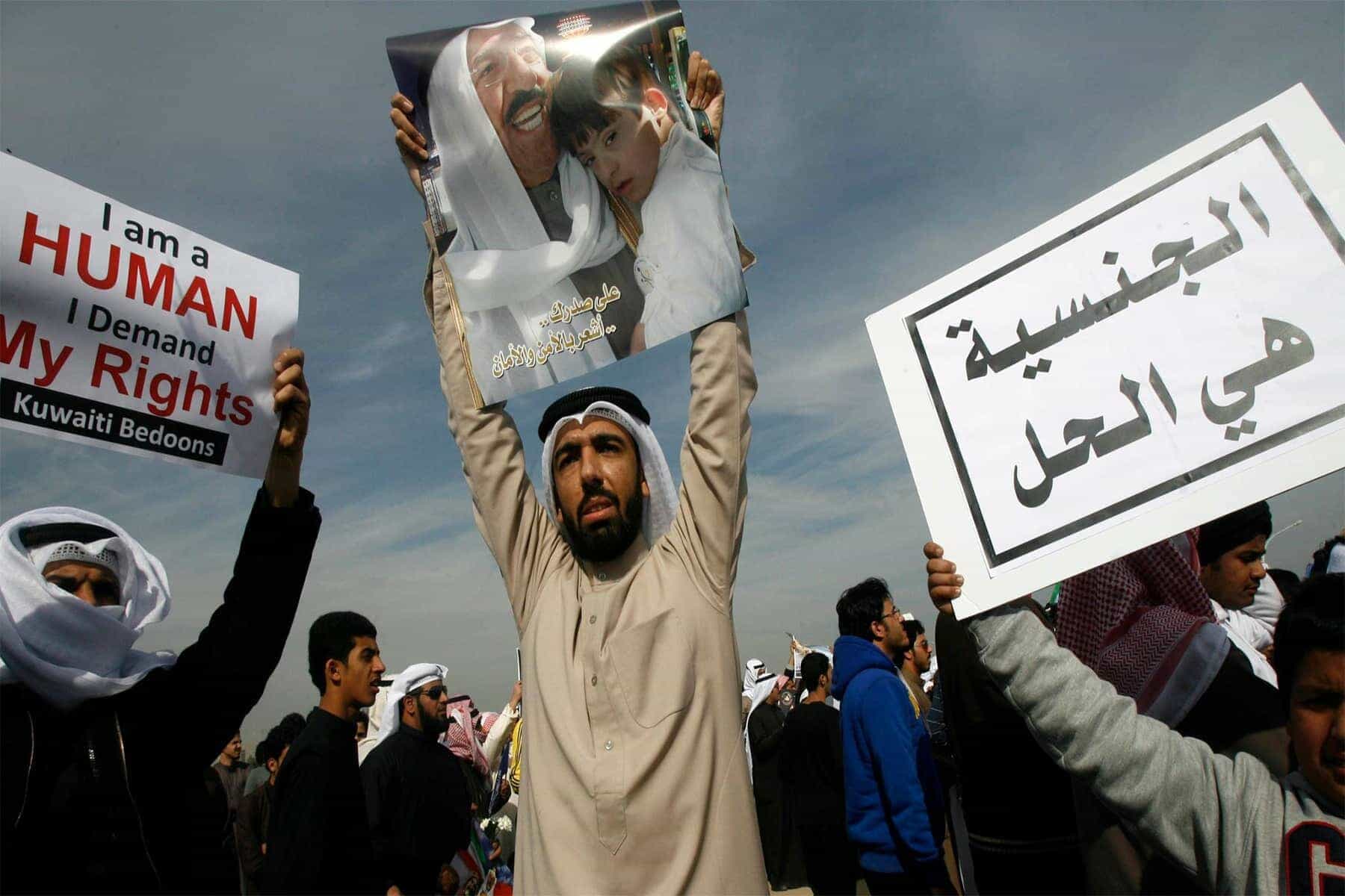 وفي الكويت نحو مئة الف شخص ولدوا فيها ويطالبون بجنسية البلد ، يطلق عليهم محليا “البدون”.