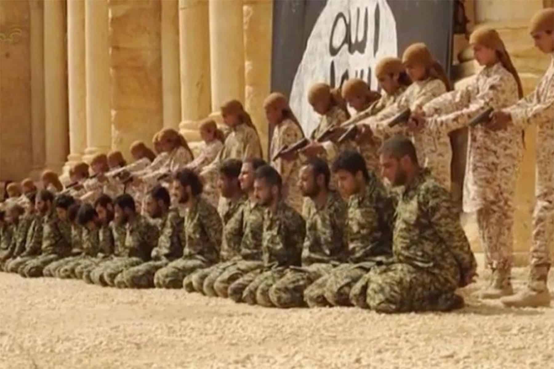 ونشر التنظيم، السبت ، فيديو لعملية الاعدام وهو يقوم بتقييد أكثر من 25 شخصاً بالحبال، من قوات نظام بشار الأسد وسط أثار مدينة تدمر ومتحفها العريقة ليقوم بإطلاق النار علي رؤوسهم.