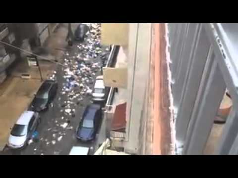 كانت بيروت يوم أمس على موعد مع مشهد مرعب حيث جرفت المياه في شوارعها أكوام من القمامة فبدت وكأن إعصارا “تسونامي قمامة” اجتاحها، وأظهر شريط فيدو صُور من أعلى بناية مئات الأكياس وبقايا القمامة وهي تسير بانسيابية مع المياه التي اجتاحت المنطقة، مع عدم إمكانية استيعاب المناهل لها فيما شوهدت العديد من السيارات متوقفة على جانبي الشارع، ويُسمع صوت أحد الأشخاص الذين يراقبون المشهد وهو يعلق بسخرية “يا عيب الشوم” وتظهر فجأة كمية كبيرة من القمامة التي جرفتها المياه لتتعالى أصوات الأشخاص من هول المنظر.