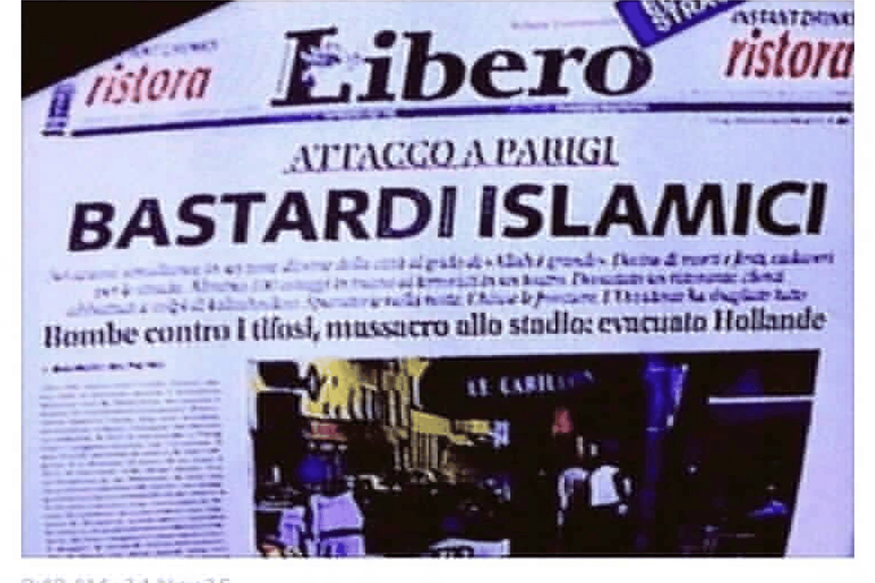 وطن- تمثل صحيفة ليبيرو الإيطالية أمام القضاء بسبب مانشيت يسب المسلمين بعد هجمات فرنسا الأخيرة التي أودت بحياة 130 على الأقل.