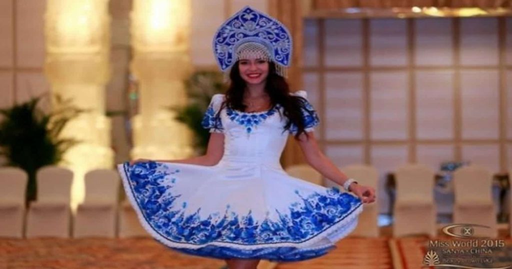 وطن- فاجئت ملكة الجمال الروسية سوفيا نيكيتشيوك جمهورها بفستان شعبي روسي عجيب خلال مشاركتها في مسابقة “ملكة جمال العالم لعام 2015” والتي تستضيفها مدينة سانيا الصينية هذه السنة، حيث صمم الفستان الذي ارتدته سوفيا وفق طراز “غجيل” الشعبي الروسي المتمثل في أزهار من اللونين الأبيض والأزرق، ويتزين الفستان باللؤلؤ والدانتيل.