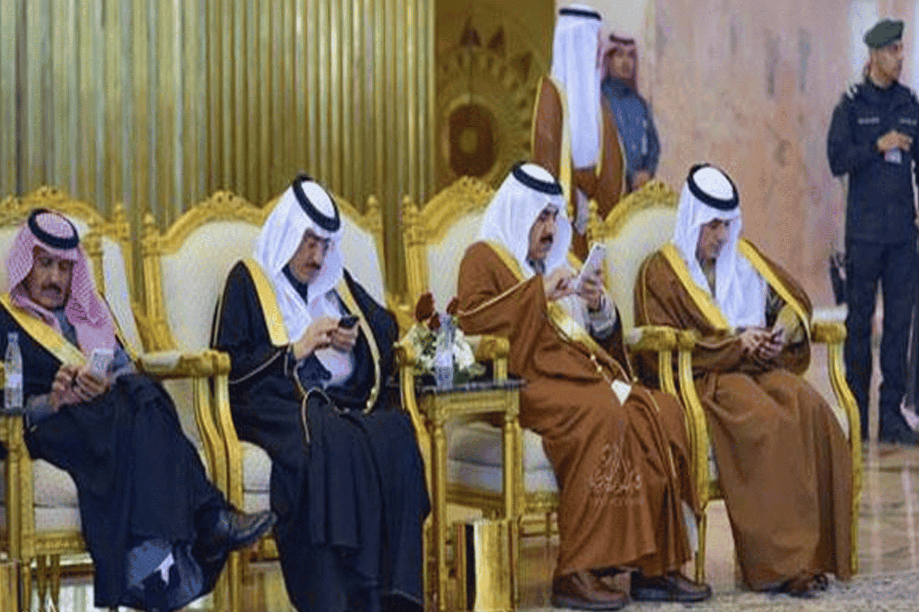 وزراء سعوديون منهمكون في تصفح جوالاتهم خلال استقبال وفود القمة الخليجية الـ 36
