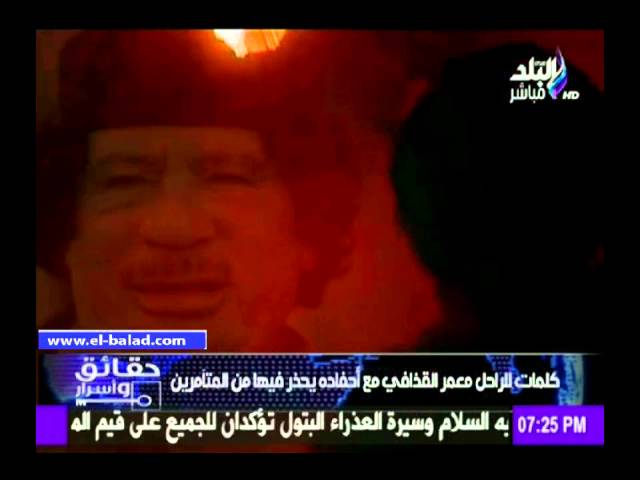 عرض الإعلامي المصري مصطفى بكري مقطع فيديو خلال برنامج “حقائق وأسرار” على قناة «صدى البلد» للرئيس الليبي الراحل معمر القذافي وهو يلقن أحفاده كلمات تحمل تحذيرات للشعب الليبي من خطورة المؤامرات الغربية..