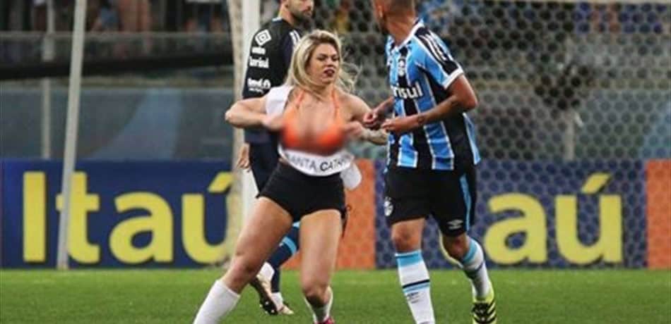 اقتحمت ملكة جمال البرازيل، “داني مورايس”، ملعب مباراة جريميو وبالميراس، في الدوري البرازيلي، والتي انتهت بالتعادل السلبي.
