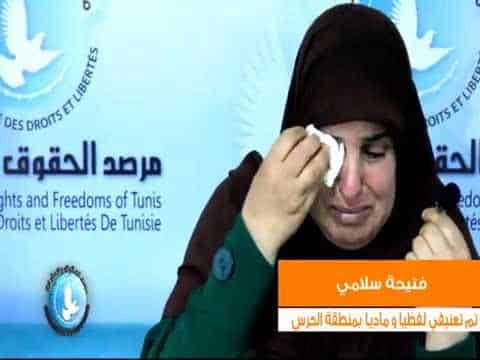 وطن – في شهادة لمرصد الحقوق والحريات بتونس، أكدت السيدة فتيحة السلامي، مواطنة مغربية بالغة من العمر 52 سنة، متزوجة بتونسي ومقيمة بتونس منذ ثلاثين سنة، أنها و بتاريخ 11 أكتوبر 2016 تعرضت للعنف اللفظي والمادي داخل مركز الحرس الوطني (الدرك) ببومهل حيث كانت تصطحب ابنها البالغ من العمر 20 سنة للتثبت من حقيقة اتهامه بسرقة هاتف جوال أحد أبناء أعوان الأمن.