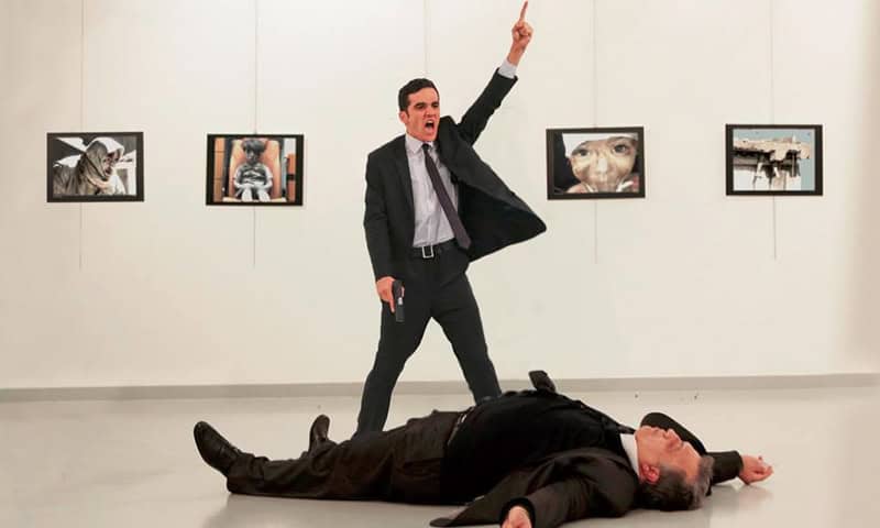 واغتيل السفير الروسي لدى تركيا أندريه كارلوف مساء الإثنين، خلال تواجده في معرضٍ فني بالعاصمة أنقرة، برصاص الشرطي التركي مولود ميرت ألطينطاش (22 عاما)، والذي قُتل برصاص الواحدات التركية الخاصة بعد اغتياله للسفير.