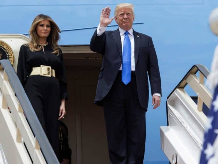 وكانت ميلانيا قبل صعودها الطائرة وهي في أميركا، ترتدي “بلوزة بيضاء” وتنورة برتقالية قصيرة، لكنها غيّرت زيها في الطائرة وارتدت العباءة السوداء قبل وصولها إلى الرياض.