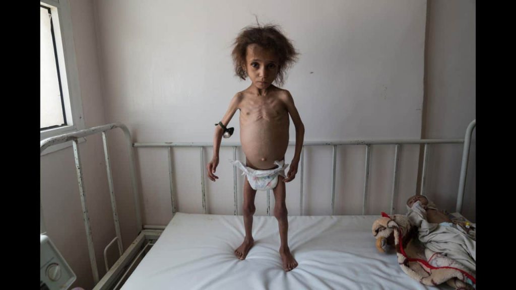 وقالت “سي إن إن في تقريرها: “بتول علي طفلة تبلغ من العمر ست سنوات، عظام هذه الطفلة بارزة على بطنها المنتفخ، فبتول تزن أقل من 16 كغ وهي واحدة من ما يقارب نصف مليون طفل في اليمن يعانون من سوء التغذية الحاد، وفي مستشفى آخر، شاهدنا علي انحري يجلس ويضع ابنته إسراء في حضنه، عيناها منتفختان وموصول في يدها سيروم إنها تعاني من مرض الكوليرا، حيث يقول علي: “أنا خائف بالطبع، ثلاثة من أطفالي يعانون الآن من وباء الكوليرا، وأنا منذ ثمانية أشهر دون راتب، لذلك نحن لا نمتلك المال، إن علاج هذا المرض مكلف جدا”.