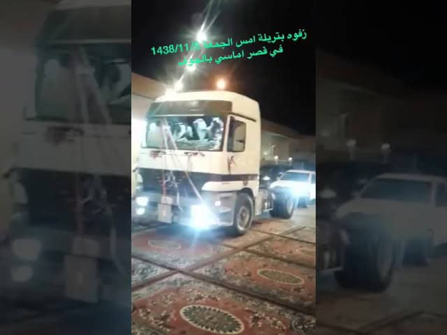 ,أظهر مقطع الفيديو المتداول عبر مواقع التواصل الاجتماعي، العريس وهو يدخل قاعة الحفل بشاحنة تريلا حيث كان يقودها أصدقاؤه لمشاركته فرحته، واصطف أقاربه وأصدقاؤه لتهنئته.