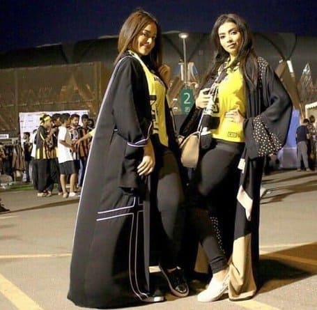 ووفقا للصورة المتداولة التي رصدتها “وطن”، فقد ظهرت المشجعتان بلباس غير لائق، حيث ظهرن وهن يرتدين “تي شيرت” النادي مع بنطلون “فيزون” مفصل لجسدهن ومن غير غطاء شعر بعباءة مفتوحة.
