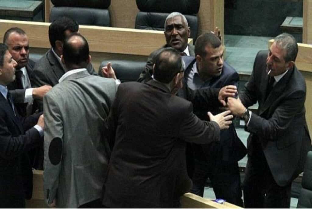 ولاحقا حاول النائب زيد الشوبكي، التهجم على الرياطي، قبل منعه من قبل النائب صداح الحباشنة الذي قذف مجموعة من زجاجات المياه و”عقال” كان يضعه أحد النواب على النائب الشوابكة.