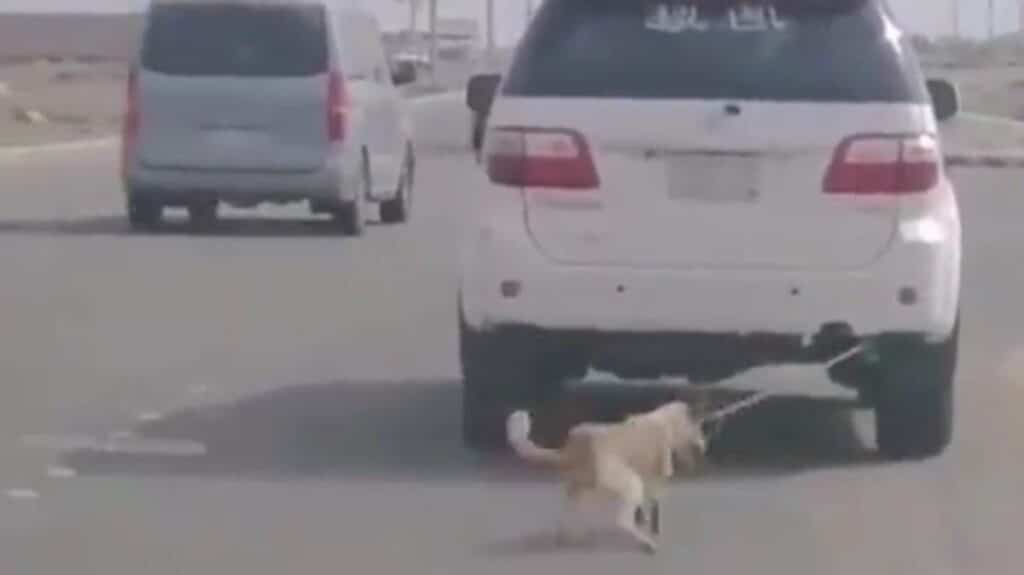 وأظهر المقطع سائق مركبة وقد ربط الكلب في مركبته من الخلف وسحبه في أحد الشوارع في مشهد مؤلم وصادم.