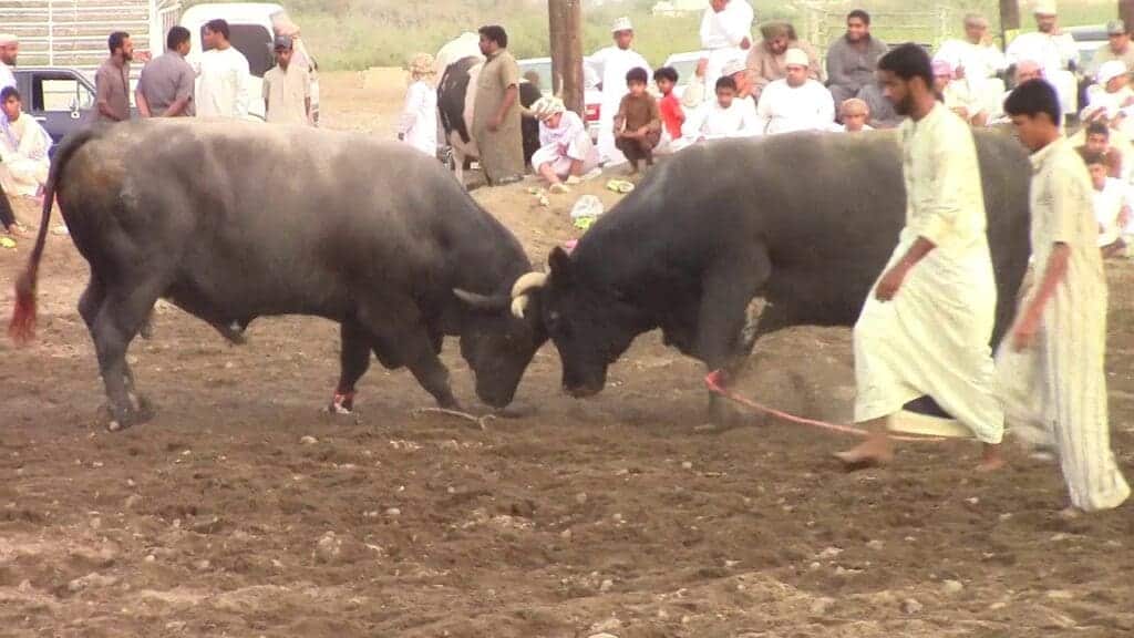 تداول ناشطون عمانيون عبر موقع التدوين المصغر “تويتر” مقطع فيديو لمصارعة ثيران أقامها مواطنون عمانيون في محافظة صحار، وأثارت حالة من الجدل بعد وفاة أحد الثيران بطعنة من الثور المنافس.