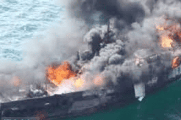 أول لقطات مصوّرة لتفجيرات ميناء الفجيرة .. إحدى السفن تعرضت لضربة قوية كادت تغرقها