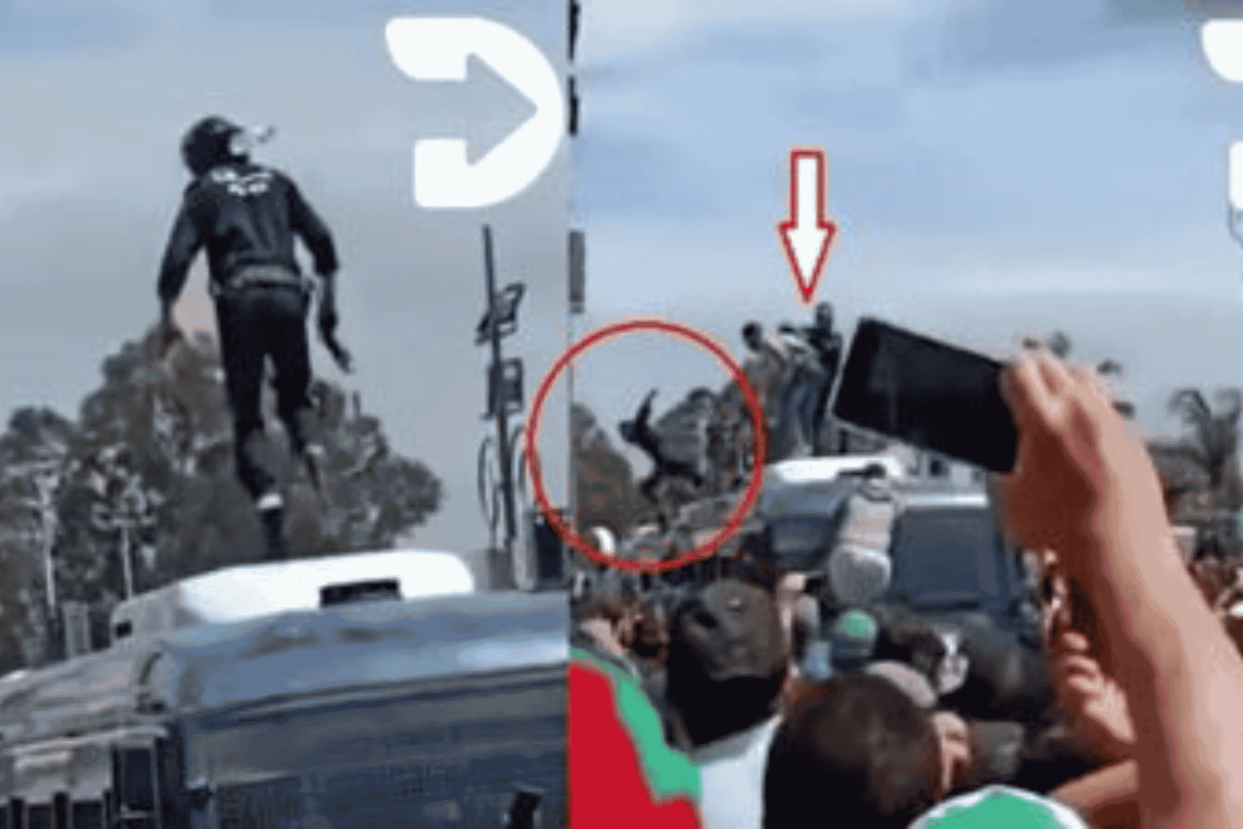 ويُظهر الفيديو، الشرطي وهو يرشّ الغاز من فوق العربة العسكرية على متظاهرين يحيطون بها، قبل أن يعتلي متظاهران العرب ويدفعانه أرضا.