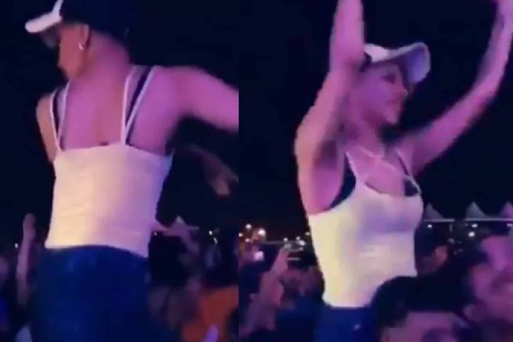 وفي الوقت الذي كانت ترقص فيه الفتاة على أكتاف ذلك الشاب، كان آخرون من حولهما يوثقون الفيديو والصور المشهد الفاضح.