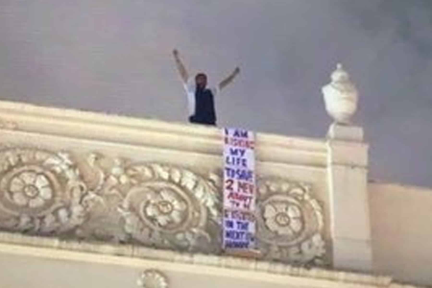 وطن- تداول نشطاء على موقع التواصل الاجتماعي “تويتر” مقطع فيديو لناشط بحريني، يدعى موسى الستراوي، وهو يعتلي سطح سفارة بلاده في لندن، مهددا بالانتحار احتجاجا على حكم إعدام بحرينيين اثنين.