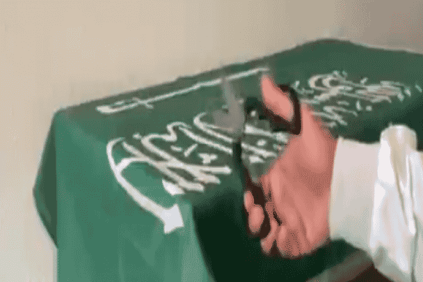 وأظهر المقطع المتداول المواطن السعودي يمسك بمقص ويقطع كلمة التوحيد من العلم، مبررا ذلك بأن ابن سلمان دنس هذا العلم وأساء لكلمة التوحيد بزعم التحرر والانفتاح.
