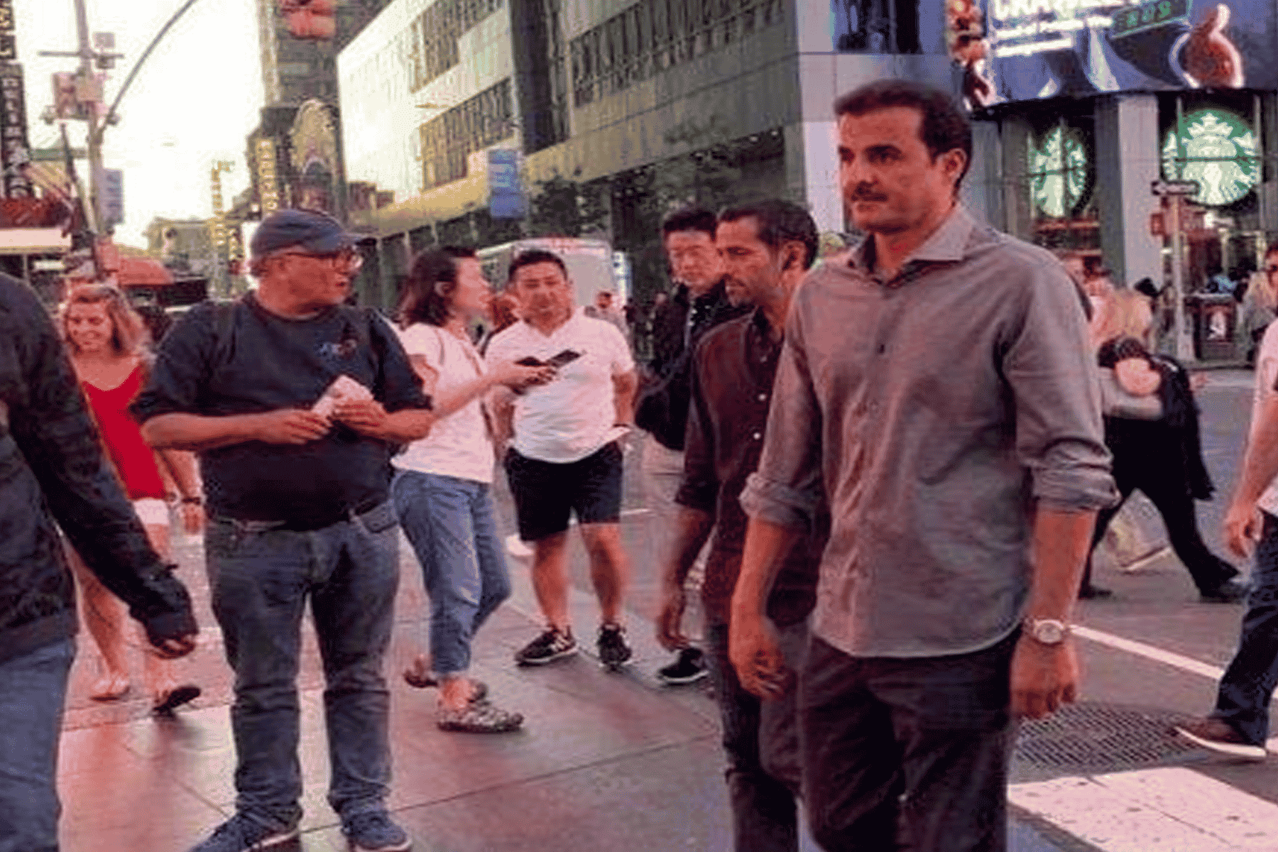 وتظهر الصورة الأمير تميم وهو يتجوّل في شوارع المدينة الأمريكية ويختلط بالمارة بلا حراسات وأمن.