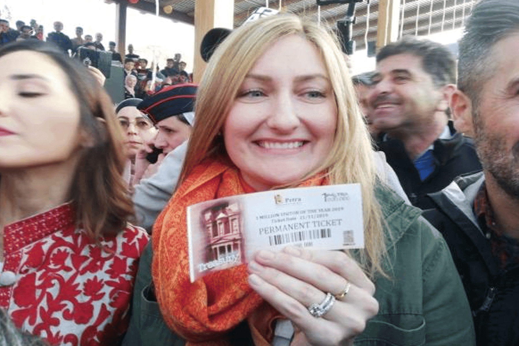 الأميركية السون كاري والتي تقيم في مدينة  “سان ديغو” ، وتعمل في مجال السياحة جاءت برفقة زوجها الطبيب الجراح لقضاء شهر العسل في الأردن، وتفاجأت الزوجة تسميتها زائر المليون.!!