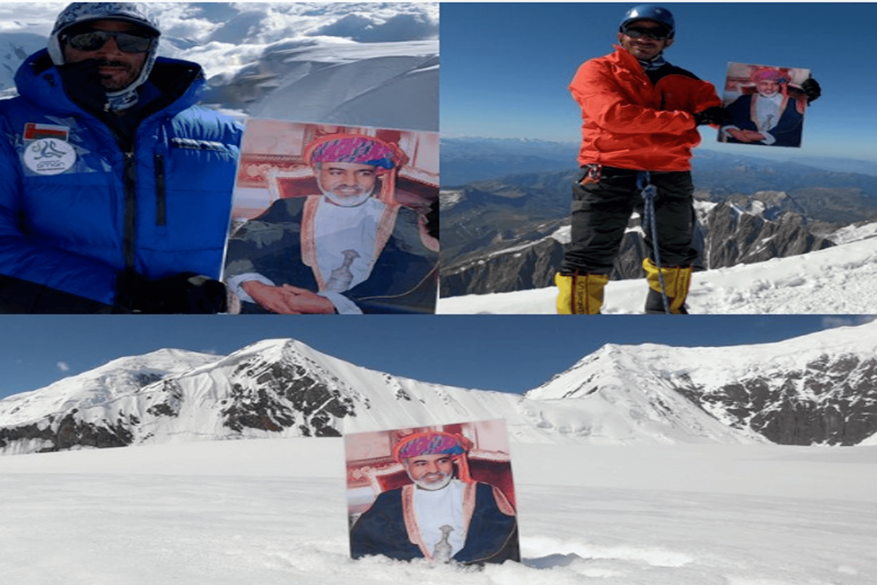 وتمكن “الناعبي”من تسلق قمة جبل جليدي ورفع فوقها صور السلطان قابوس التي اعتلت قمة الجليد في مشهد مهيب.