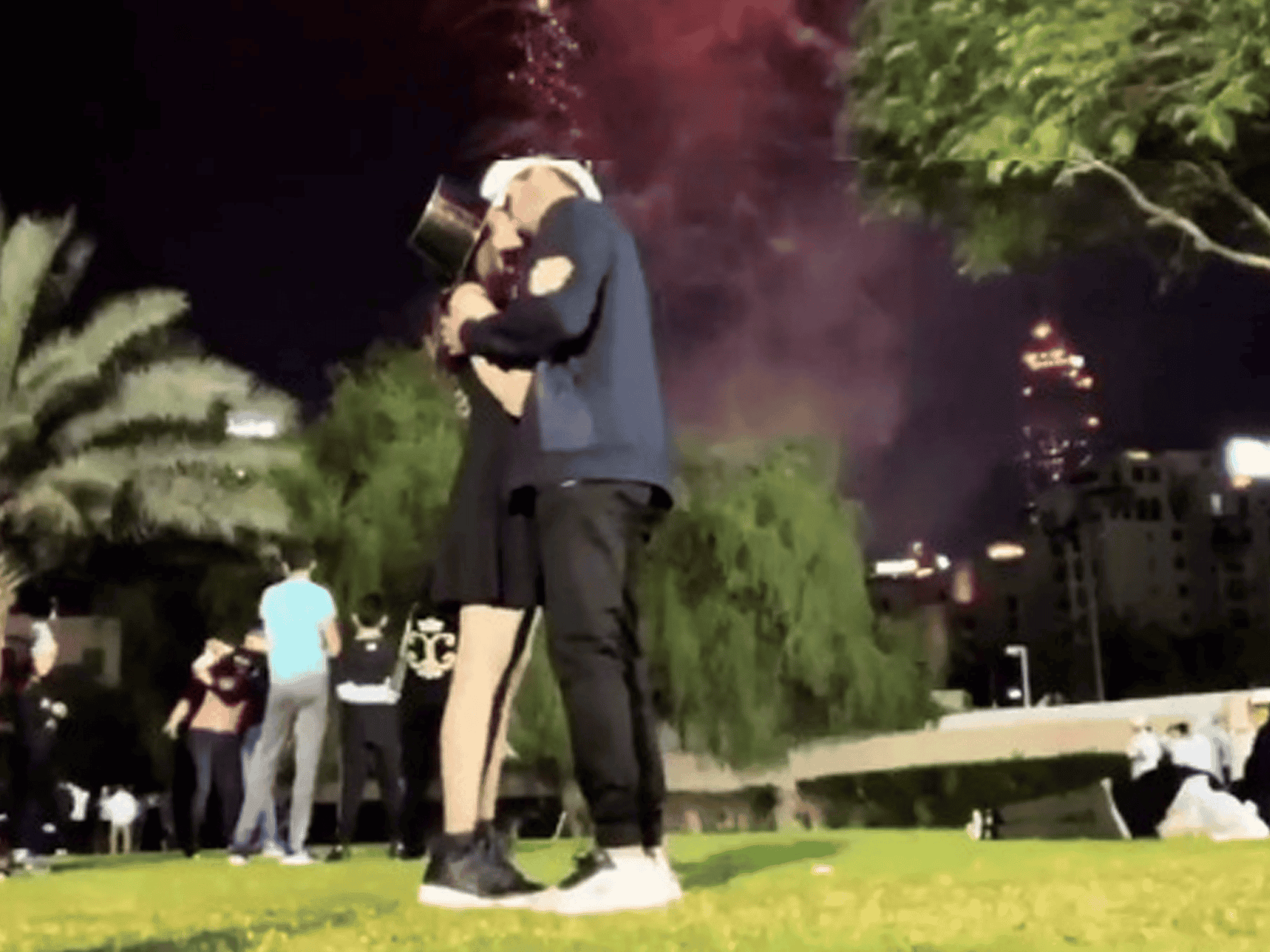 وظهرت فوز العتيبي مرتديةً فستاناً أسوداً قصيراً، وهي تقبّل زوجها بطريقةً حميمة في حديقةٍ عامة خلال احتفالات السنة الجديدة.