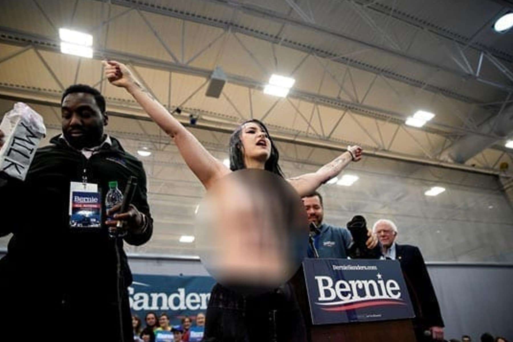 وطن– فاجأت فتيات عاريات الصدر السيناتور الديمقراطي بيرني ساندرز منافس الرئيس الأمريكي دونالد ترمب خلال حملته الانتخابية للرئاسية الأمريكية 2020.