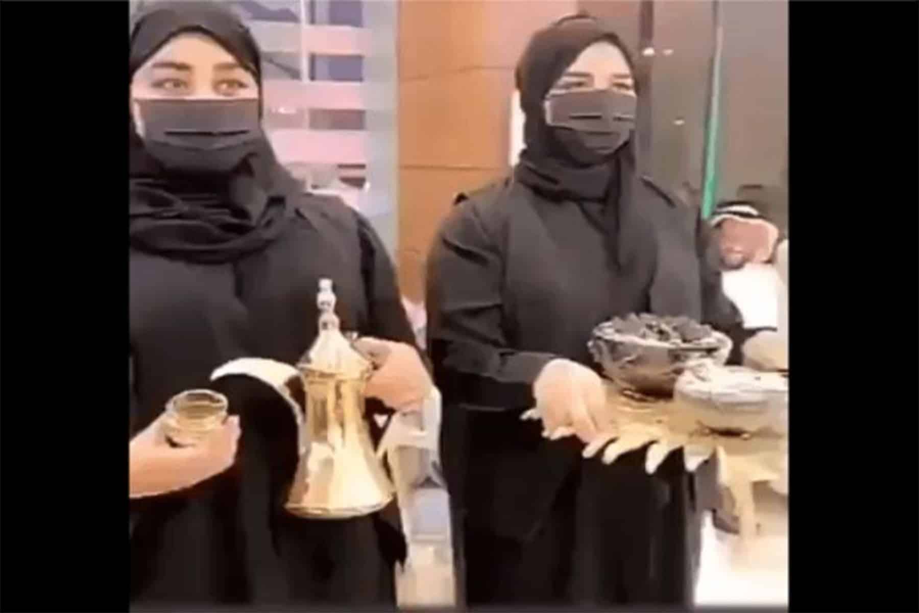 ويظهر المقطع المتداول على نطاق واسع سيدات يقفهن وسط صالة كبيرة للاجتماعات يتواجد بها عدد كبير من الرجال، ويمسكن بالقهوة وصواني الضيافة في مشهد اعتبره السعوديون إهانة للمرأة.