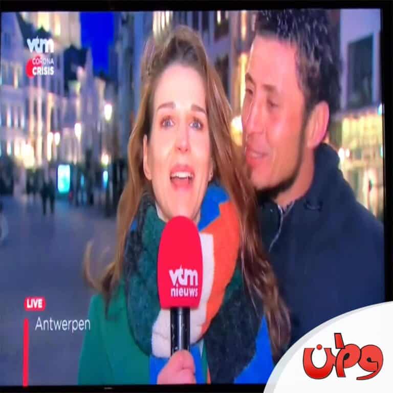 وطن _ شاب قبل مذيعة تلفزيونية على البث المباشر الأمر الذي أدى إلى خجل الشابة واحمرار وجنتاهوطن _ جذبت مراسلة قناة “في تي إم” البلجيكية، أثناء قيامها ببث مباشر من شارع أنتويرب، يوم السبت الماضي، انتباه شاب، حيث اقترب منها وأقدم على تقبيلها.ا.