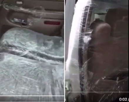وفصل الأب بين الكرسيين الأماميين والكرسي الخلفي، بحاجز بلاستيكي من أكياس النايلون، وقام بتغليف كل الكراسي الخاصة بالسيارة بذات الغلاف، ليمنع حدوث أي عملية نقل للفيروس داخل السيارة، وكي يتمكّن من توصيل ابنه فيها.
