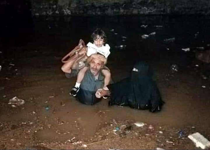 وكانت صورة طفلة يرفعها والدها ووالدتها عن مستوى الماء لمحاولة إنقاذها، هي الأكثر تداولاً، وعلق عليها الناشط أركان الحمادي: “آه يكاد الماء يغمرها وعينها على طفولتها! عظمة الأمومة التي لا مثيل لها