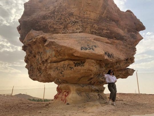 وظهرت مشاعل الجلعود في مقطع فيديو رفقة صديقة لها من أمام صخرة “عنترة وعبلة” في محافظة “عيون الجواء” بالقصيم، كما يظهر بالمقطع.