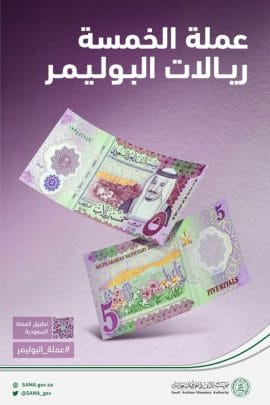 أعلنت مؤسسة النقد العربي السعودي (ساما)، طرح عملة ورقة جديدة من فئة الخمسة ريالات، مصنوعة من مادة البوليمر ، يبدأ تداولها اعتباراً من غد الإثنين 5 أكتوبر 2020.