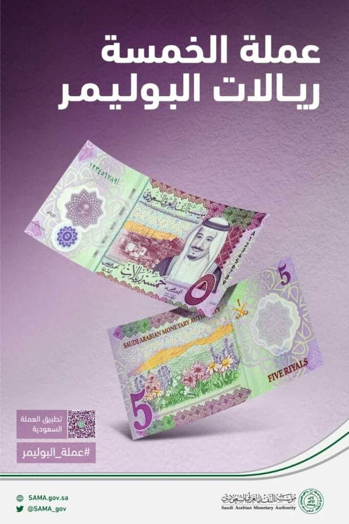 نحو خطوة جديدة لتطوير العملة الوطنية، أصدرت #مؤسسة_النقد فئة الخمسة ريالات الجديدة والمصنوعة من مادة البوليمر.#عملة_البوليمر#SAMA pic.twitter.com/6fmAWrG5d8