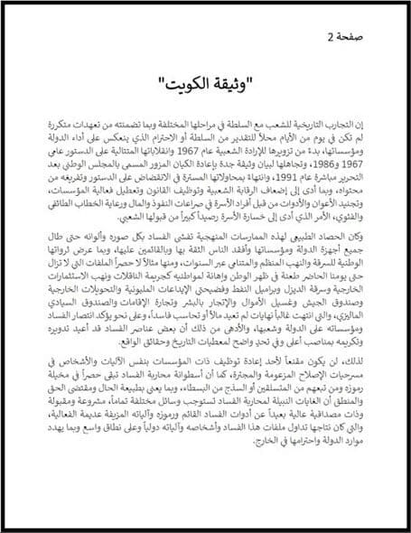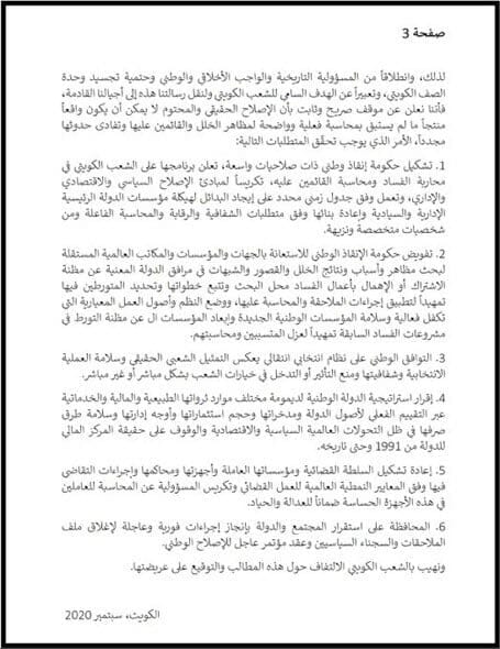 وأوضح أن مطالب الوثيقة 6، من أبرزها تشكيل حكومة انقاذ وطني “تنتشل الكويت مما هو فيه من ضياع لدى الرأي العام”. والمطالبة بالتحقيق في الوضع المالي للدولة، وغيرها .