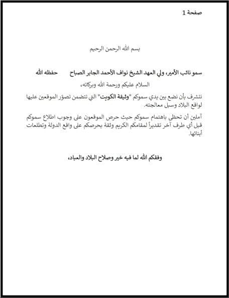 وقال “النفيسي” إن “وثيقة الكويت” تتكون من ورقتين، وقدمت الى الشيخ نواف، لأخذ رايه فيها وتشكيل لجنة للنظر فيها، حيث وافق الشيخ نواف .