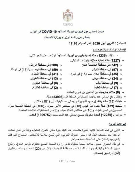 وسجلت اليوم السبت ، ” 1235 ” إصابة بفيروس كورونا المستجد في الأردن ، منها 1227 محلية، ليرتفع إجمالي عدد الإصابة إلى ” 23998 ” حالة ، إلى جانب 15 وفاة ليرتفع إجمالي عدد الوفيات إلى 181 حالة منذ بدء الجائحة ، وفق موجز إعلامي حول فيروس كورونا المستجد COVID-19 في المملكة صادر عن رئاسة الوزراء ووزارة الصحة.