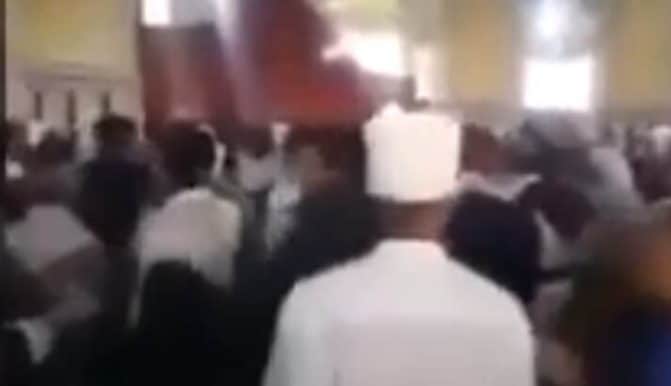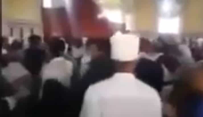 ويظهر الفيديو أصواتاً صارخة للمصلين وهم يرددون: (ثورة.. خربتوا البلاد.. أكلتوا العباد.. اطردوه).