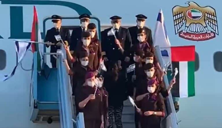 أظهر مقطع فيديو تداوله رواد مواقع التواصل الاجتماعي لحظة هبوط طائرة تجارية تابعة لشركة طيران أبوظبي الوطنية “الاتحاد” في مطار بن غوريون الإسرائيلي، حيث تعد أول طائرة إماراتية تهبط في إسرائيل منذ توقيع اتفاق التطبيع مع الإمارات والبحرين.