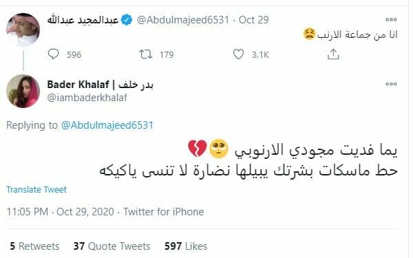 جاء ذلك بعد أن غرّد عبدالمجيد عبدالله قائلاً: “أنا من جماعة الأرنب”، ليردّ عليه “خلف” بالقول:”يما فديت مجودي الارنوبي حط ماسكات بشرتك يبيلها نضارة لا تنسى ياكيكه”.