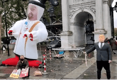 المشاركون في التظاهرة التي نظمت في ميدان “ماربل آرش” الشهير، وسط لندن، رفعوا بالونا كبيرا حمل صورة ولي عهد أبوظبي محمد بن زايد في إشارة إلى دور الإمارات بالضغط على السودان، لتطبيع العلاقات مع الاحتلال.