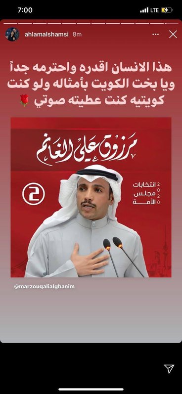 ونشرت أحلام صورة لمرزوق الغانم عبر خاصية الستوري على “انستجرام”، وحثت جمهورها الكويتي إلى التصويت له قائلة: “هذا الانسان أقدره واحترمه جدا ويا بخت الكويت بأمثاله ولو كنت كويتية كنت عطيته صوتي”.