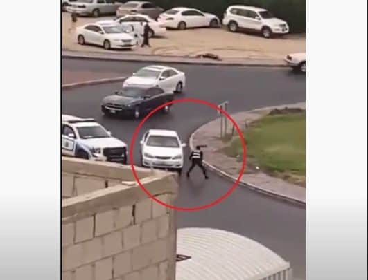 ويظهر في الفيديو الذي نشر ورصدته “وطن”، لحظة محاولة الشرطي إيقاف أحد المستهترين، وحين اقترب من السيارة ومر من أمامها، تفاجأ بالمستهتر ينطلق بسرعة للهرب.