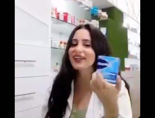وعلى ألحان أغنية “البنط العريض” للفنان الإماراتي حسين الجسمي، غنت الصيدلانية اللبنانية التي ذكر الناشطون أنها تدعى جويل مغامس قائلة: “رح قولها بالبنط العريض، رح روح فيها بالوريد، حالتي رح بتصير جنون والصيدلي صار مريض”.