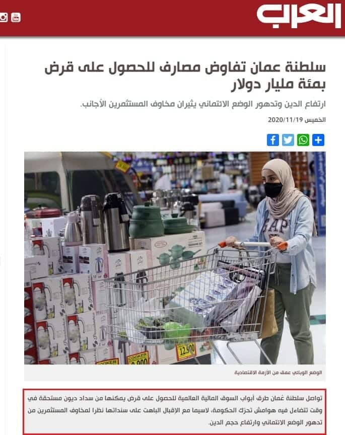 وزعمت أيضاً، أنّ عُمان تجري محادثات مع مجموعة من البنوك بشأن قرض بما لا يقل عن 100 مليار دولار.