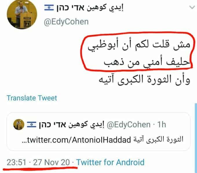 وكتب “كوهين” في تغريدة حذفها لاحقاً:” مش قلت لكم أن أبوظبي حليف أمني من ذهب وأن الثورة الكبرى آتية “.