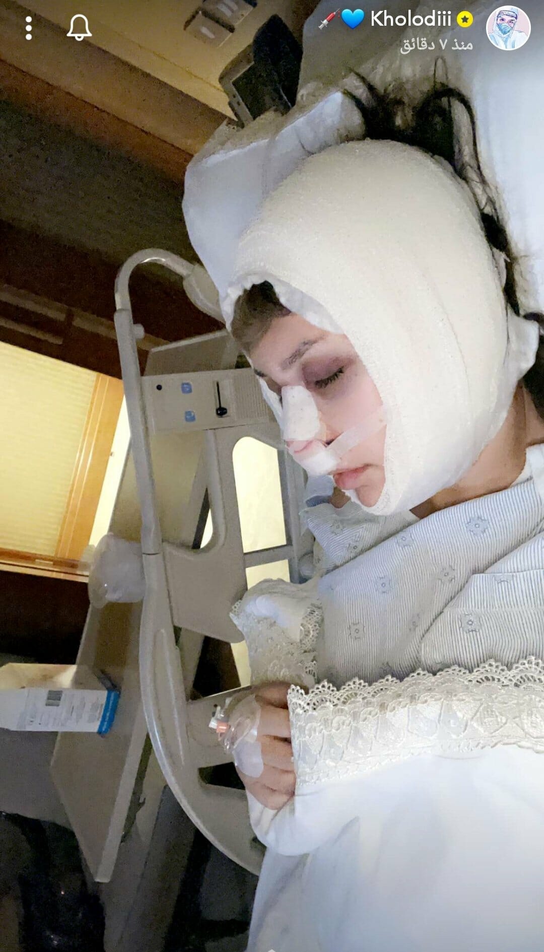 وظهرت الدكتورة الكويتية خلود في الصورة وهي على سرير الشفاء، وقد لُفّ رأسها، وأنفها، وذلك في أعقاب إجرائها عملية تجميل.