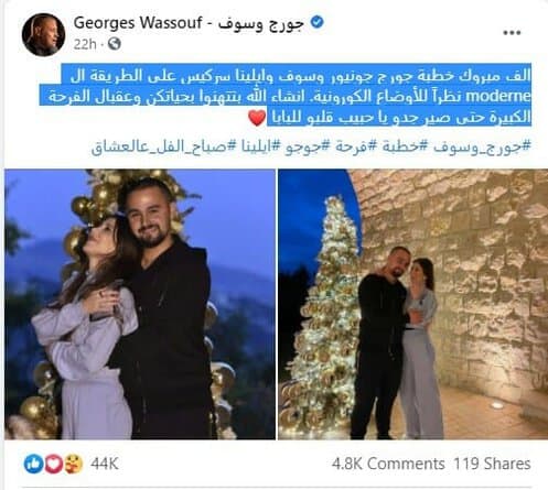 وكتب “أبووديع”: “الف مبروك خطبة جورج جونيور وسوف وايلينا سركيس على الطريقة ال moderne نظراً للأوضاع الكورونية. انشاء الله بتتهنوا بحياتكن وعقبال الفرحة الكبيرة حتى صير جدو يا حبيب قلبو للبابا”.